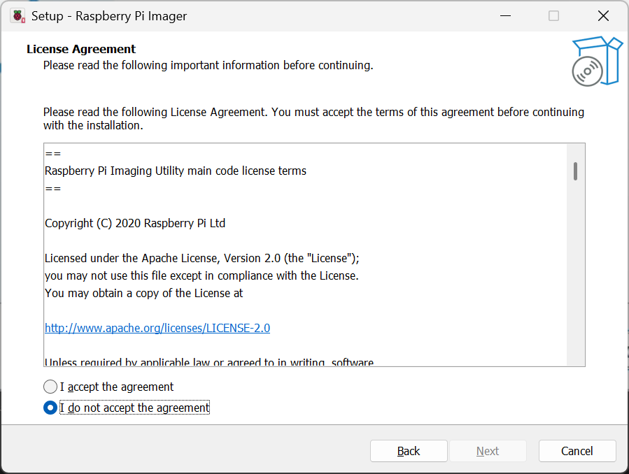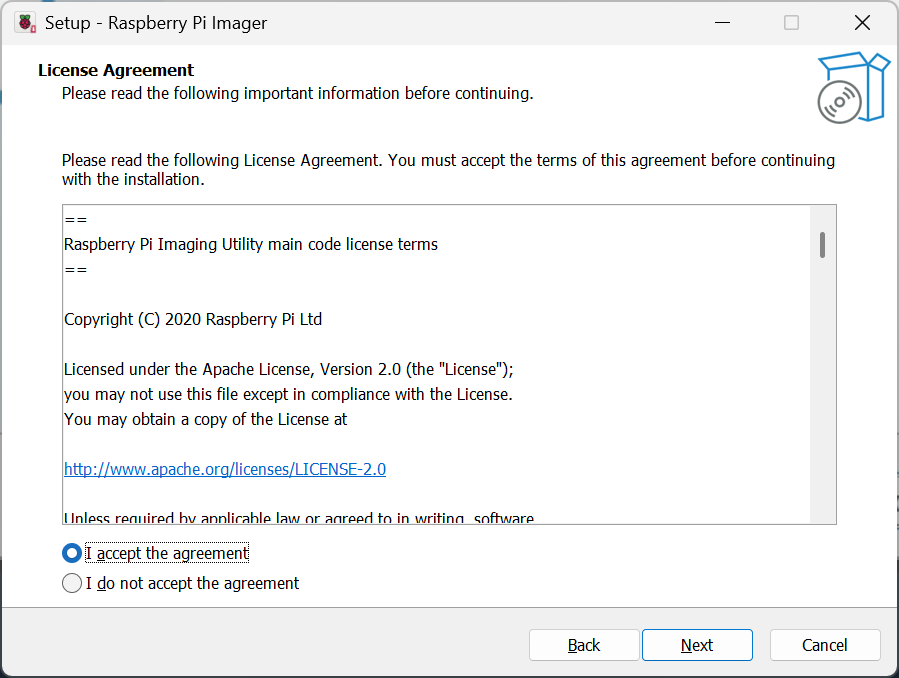 「I accecpt the agreement」をクリック→「Next」をクリック